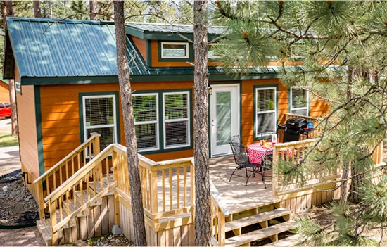 On-site recreation includes horseback riding, hiking, and biking trails. The resort schedules nightly movies, live music, and a chuckwagon dinner show. Palmer Gulch sits 35 miles southwest of Rapid City, South Dakota.