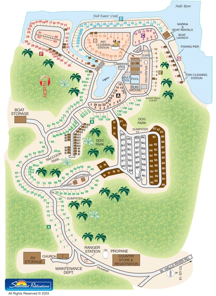 Nature's Resort Campground features an on-site camp store for supplies and a boat ramp for direct access to the Halls River and Gulf of Mexico.