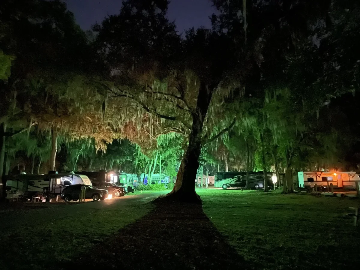 Guests choose from pull-through RV sites, tent camping areas, and five rustic cabins with screened patios. The campground sits 3 miles from Daytona Beach Shores. Daytona International Speedway and Ocean Walk Shopping Center are 8 miles away.