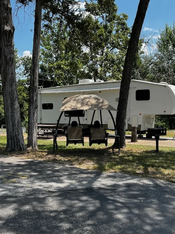 A nature trail winds through the shaded property. The park hosts seasonal events like outdoor movies and live music. Two rental RVs, The Velvet Buck and The White Squirrel, accommodate short-term stays.