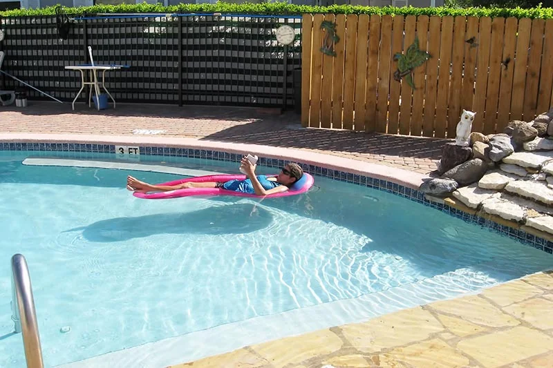 Palm Gardens RV Park offers a heated, year-round swimming pool, an invigorating whirlpool hot tub spa, a shuffleboard court, and a large recreation hall (Fiesta Hall). Additional facilities include a clean, modern laundry room, a book lending library, pool tables, horseshoe pits, and beautifully landscaped grounds.