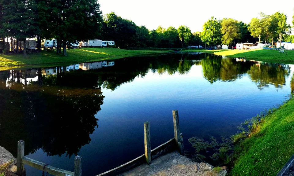 An on-site fishing pond holds stocked fish for guest use. The campground borders Erie Bluffs State Park for hiking and views. Nearby trout streams include Elk Creek, Walnut Creek, Trout Run, and Raccoon Creek.