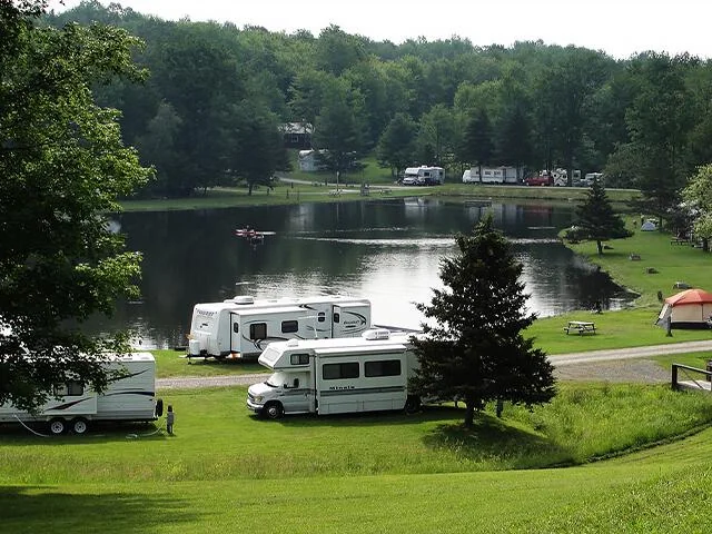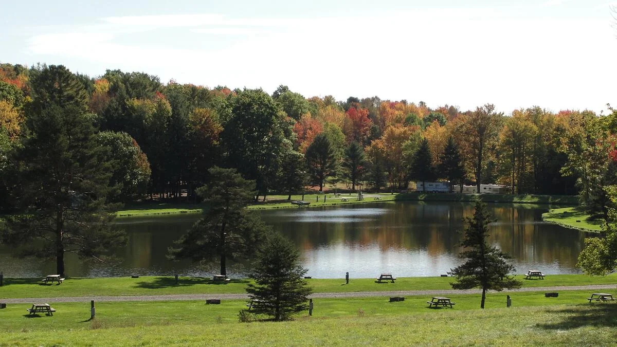 Pine Valley Campgrounds sits on rolling hills in Endicott, New York, 10 miles west of Binghamton. The park surrounds a six-acre lake with 130+ wooded and open campsites.