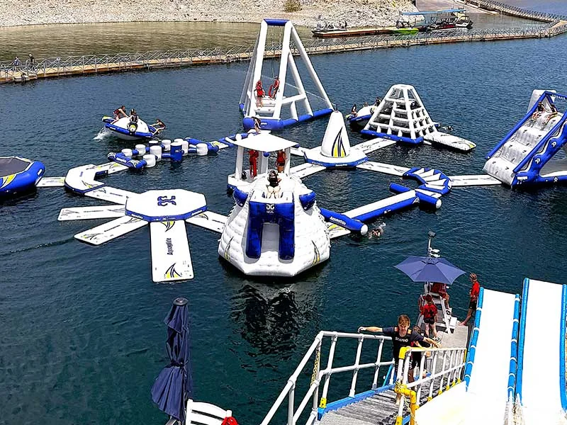 The resort's amenities include Dillon's Bayou Restaurant with live entertainment, a camp store within the marine supply shop, and a full-service marina with boat launch and retrieval services. The property also offers a floating waterpark with a large inflatable course and waterslide, plus a dedicated area for sunbathing and swimming.