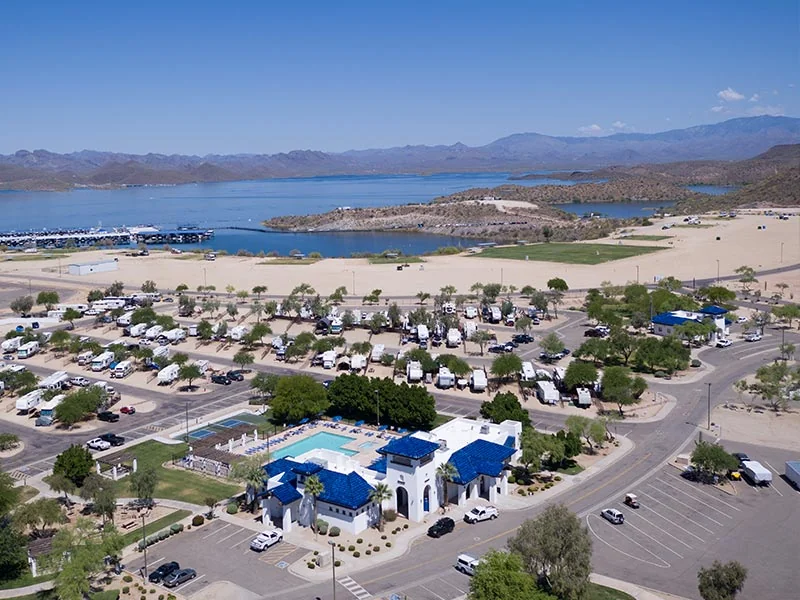 Pleasant Harbor RV Resort sits directly on Lake Pleasant in Peoria, Arizona, a 45-minute drive from downtown Phoenix. This waterfront resort combines full-hookup RV sites with a full-service marina and a floating waterpark.