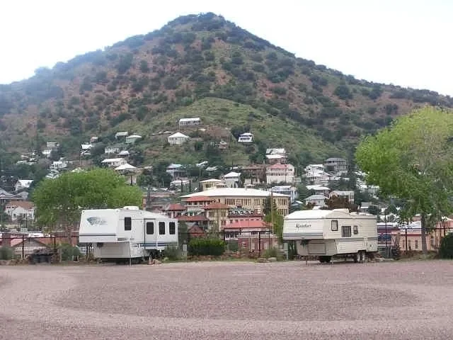 Queen Mine RV Park sits on a quiet hilltop in Bisbee, Arizona. It offers 25 full-hookup sites with panoramic views of the historic mining town.