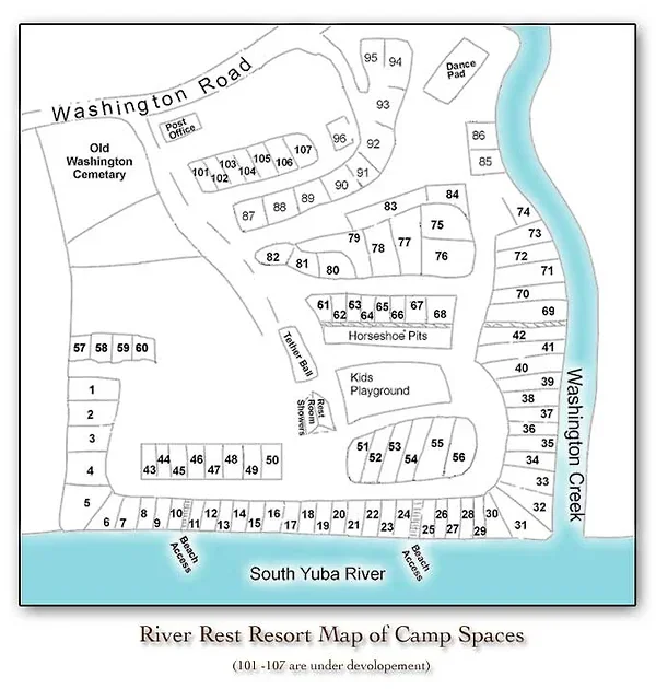 River Rest Resort sits on the South Yuba River in Washington, California, 90 minutes north of Sacramento. This family-owned campground offers RV and tent sites with full hookups and 50-amp service.
