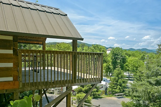 Riveredge RV Park provides 175 RV sites and multiple cabin types. The park sits within a short drive of Gatlinburg and Great Smoky Mountain National Park. Cabin options range from rustic camping cabins to deluxe park cabins.