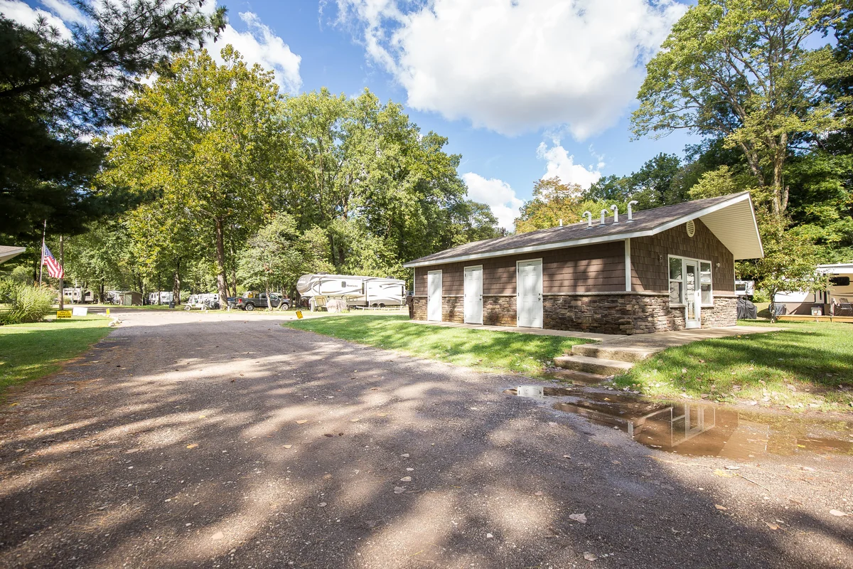 Riverfront Park Campground amenities include a sandy beach on a private pond, a playground, a bathhouse, a basketball court, and laundry facilities. The campground permits golf carts and operates a camp store selling ice, firewood, and bait. Free WiFi is included throughout the property.