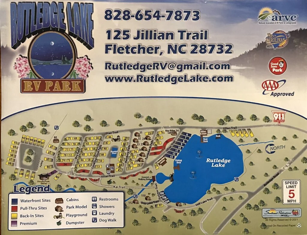 Rutledge Lake Park is a year-round RV resort in Fletcher, North Carolina, 15 miles south of Asheville. The park centers on a private catch-and-release fishing lake with complimentary paddle boats and canoes.