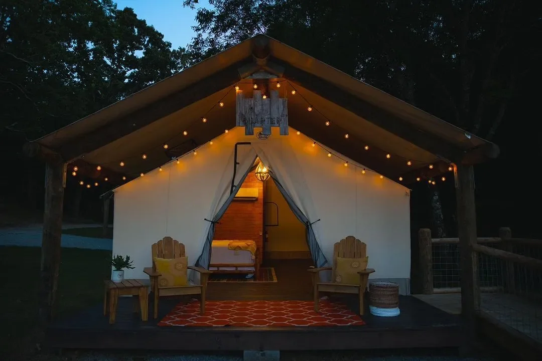 Palomino RV Resort features comprehensive amenities including a game room, firepits at each site, picnic tables, and complimentary high-speed internet. The resort also offers glamping tents with queen beds and private half bathrooms for those without an RV.