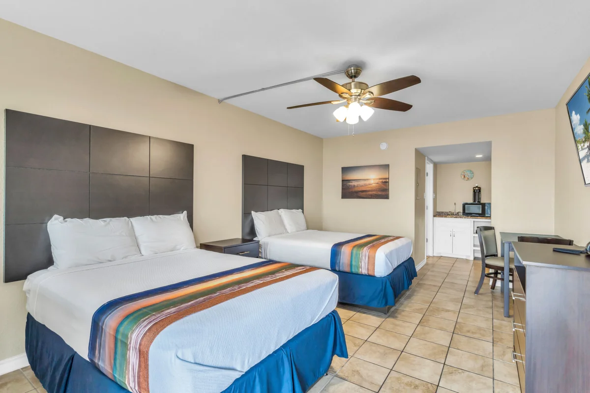 Amenities include a swimming pool, free Wi-Fi throughout the property, and a bayfront location with direct water access for fishing and kayaking. Each RV site and motel room is equipped with Roku-compatible smart TVs.