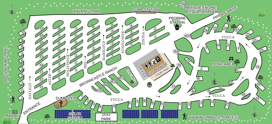 Each site features a concrete patio with a bistro table and chairs. The park includes 55 pull-thru sites for large motor coaches. The park includes 43 back-in sites.