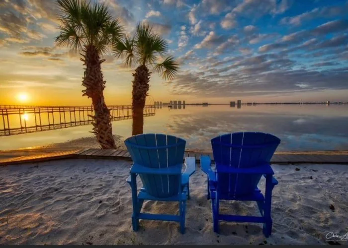 Navarre Beach and the Gulf of Mexico sit minutes away. The sound offers opportunities to spot dolphins. The property contains hundreds of palm trees.