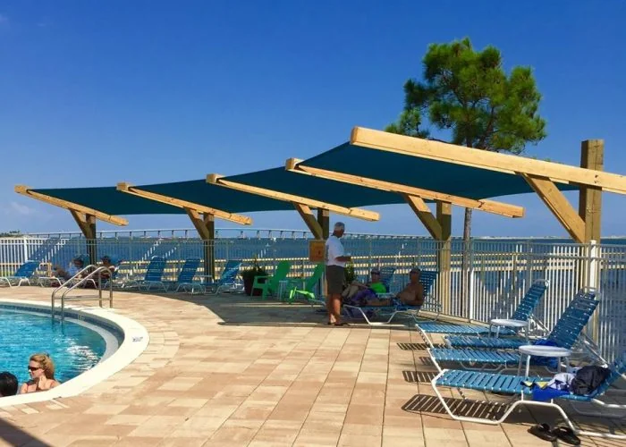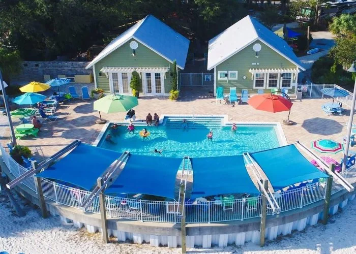 Santa Rosa RV Resort offers a heated waterfront pool, a 300-foot fishing pier, a private white sand beach, and lush tropical landscaping. The pool area includes a shade-screened lounge for comfort.