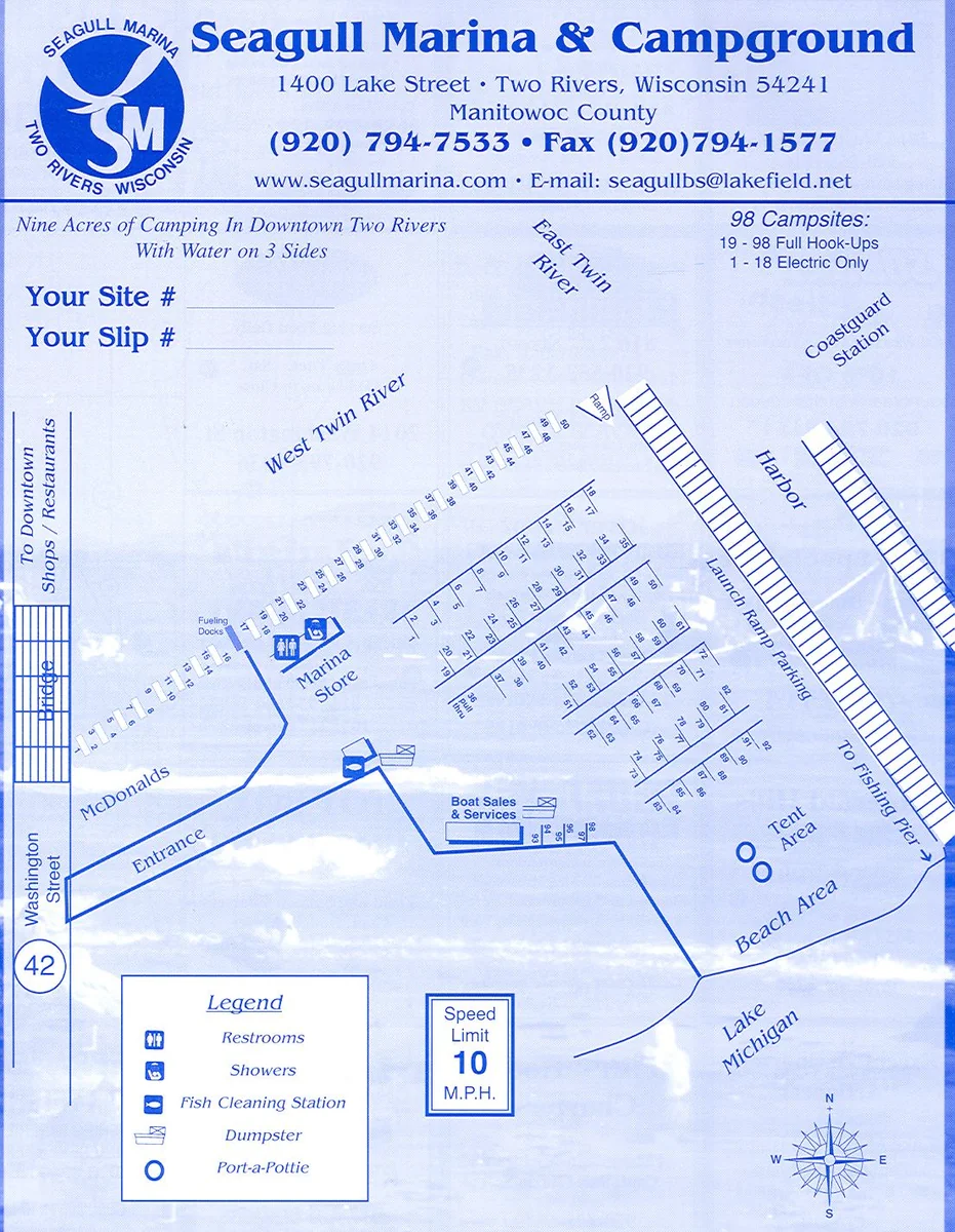 Seagull Marina & Campground sits on nine acres with water on three sides. It offers 100 waterfront RV and tent sites on Lake Michigan in Two Rivers, Wisconsin.