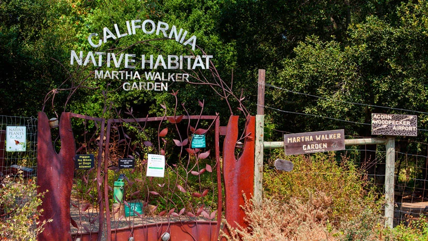 The Martha Walker Native Habitat Garden displays regional plant species. The park prohibits dogs on all trails. Winter storms can make trails wet and muddy.