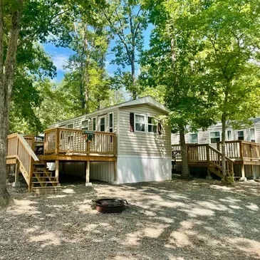 The property accommodates tent campers, RV travelers, and cabin guests. RV sites handle large rigs. Cabins include park models and bunk models with private bathrooms and kitchens.