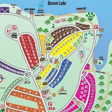 The campground offers a hiking trail, mini-golf, and multiple sports courts. The property hosts scheduled events and activities for all ages. The campground provides a full-service camping experience.