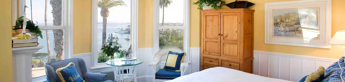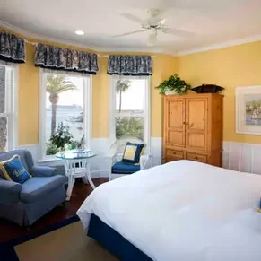 Snug Harbor Inn occupies a waterfront location in Avalon on Catalina Island. The six-room property features Cape Cod-inspired decor. Each room includes a king bed and a gas fireplace.