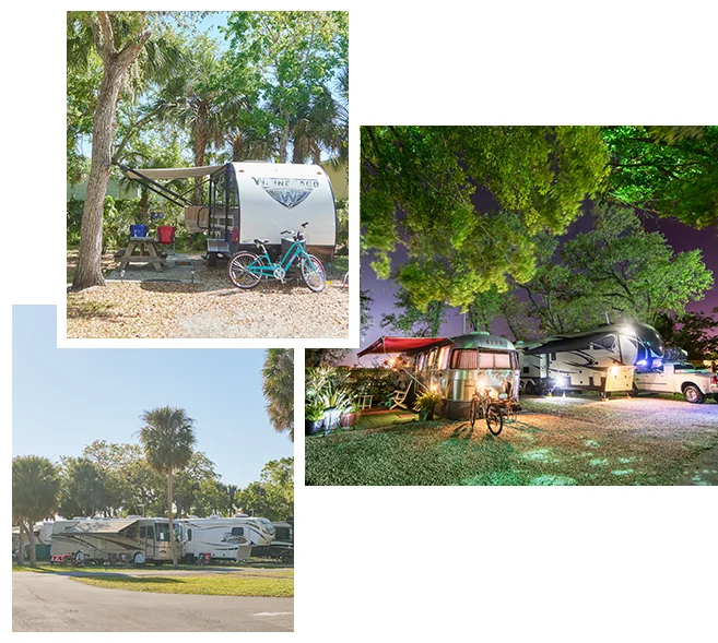 Space Coast RV Resort operates 270 RV sites with 30-amp and 50-amp electrical service. Sites include back-in and pull-through configurations with full hookups. Premium sites add concrete patios and sewer connections.