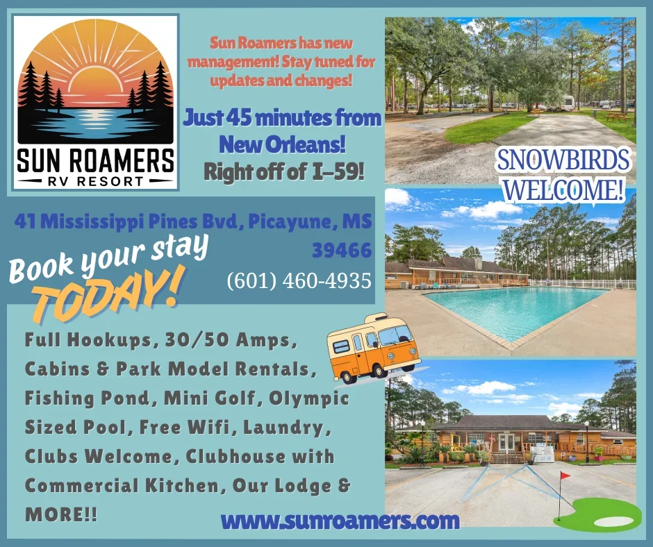 Sunroamers RV Resort sits on a pine-shaded property in Picayune, Mississippi. The park offers 155 full-hookup sites and rental cabins.