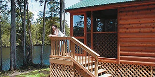 Tranter's Creek Resort offers 3000 feet of creek frontage for fishing and boating. The park provides 20/30/50 amp full-hookup RV sites with pull-through options. Creekside cabins include a full bath, double bed, heat/AC, refrigerator, microwave, fire pit, and private screened porch.
