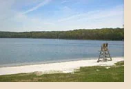 The lake features a fully stocked marina with 200 rental slips. Two sandy beaches provide swimming access during summer months. Two restaurants operate on-site: the Lakeview Lodge and the Ski Lodge.