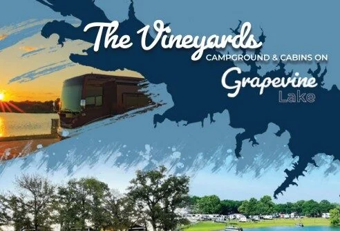 Vineyards Campground & Cabins sits on Grapevine Lake in Grapevine, Texas. The lakefront property offers 120 full-hookup RV sites and 14 furnished cabins.