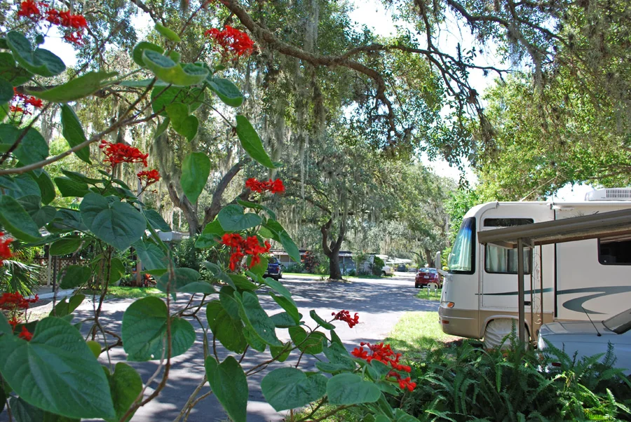 West Bay Mobile Home & RV Park restricts residency to active adults 55 years and older. The park sits under giant live oak trees with tropical landscaping. RV sites include full hookups for long-term stays.
