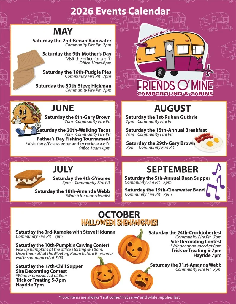 The camp store sells essentials and gifts for guests. The park sits on State Road 46 East near Brown County State Park. Nashville's artisan shops and local dining are a short drive away.