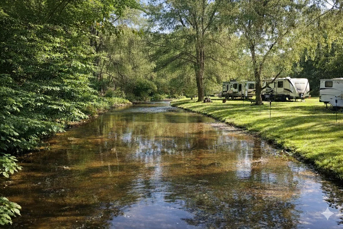 Woodstream Campsite offers creekside sites, fire pits, and wooded settings. The campground provides bathhouses, potable water stations, and a camp store with basic supplies. Seasonal activities include creek exploration and nature trails.