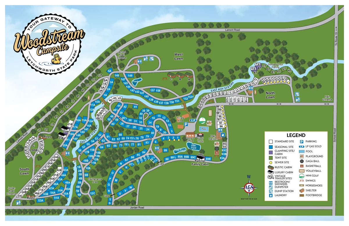 Woodstream Campsite has welcomed campers for over six decades. The family-owned campground sits on wooded hills with creek access. The property lies minutes from Letchworth State Park.